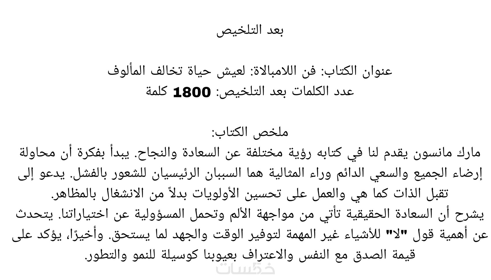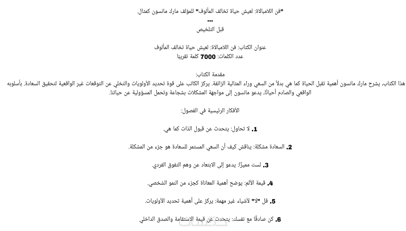 أقدم لك ملخصًا دقيقًا ومنظمًا، يختصر محتوى الكتاب بشكل شامل وواضح. على سبيل المثال، إذا كان الكتاب يحتوي على 7000 كلمة، سأقدمه لك في 1800 كلمة فقط، مع الحفاظ على جوهر الأفكار وتفاصيلها الأساسية.