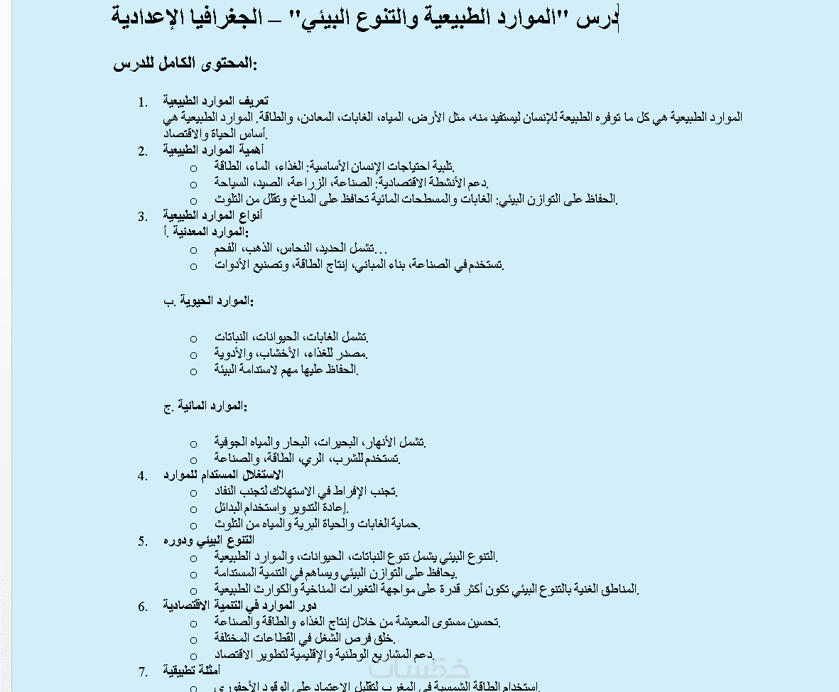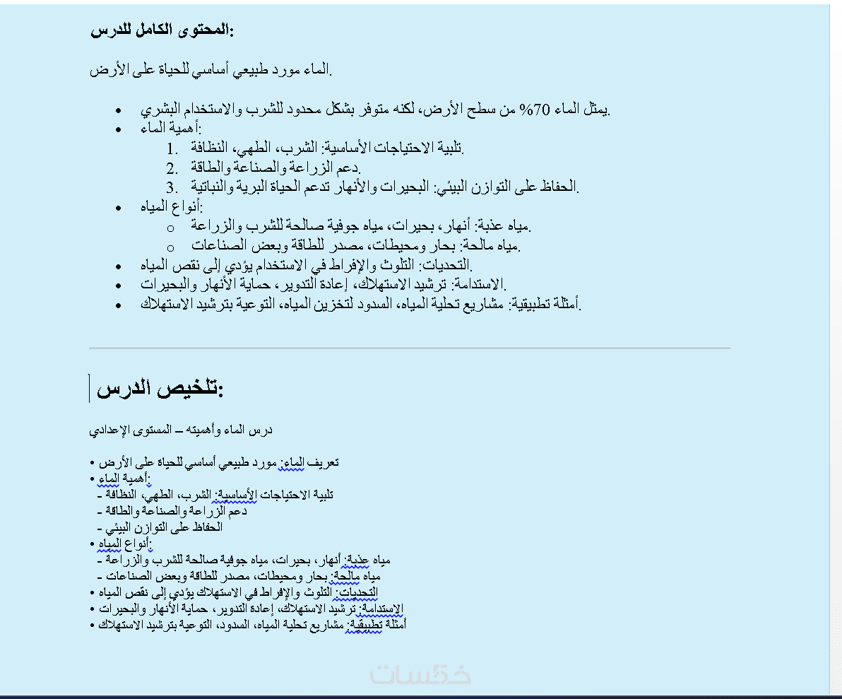 يتم تلخيص درس لا يتجاوز 3 صفحات من الكتاب أو الدفتر إلى ملخص من صفحة واحدة، بعدد كلمات يتراوح بين 250 و350 كلمة، مع الحفاظ على الأفكار الأساسية وترتيبها باستخدام عناوين ونقاط واضحة.