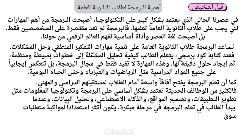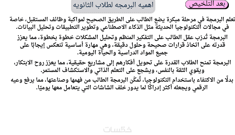 بعد التلخيص (باسلوب zeno) / الذكاء الاصطناعي هو تقنيه تحاكي الذكاء البشري (تعلم وا ستنتاج) لتطوير المجالات الحيويه بكفائه عاليه