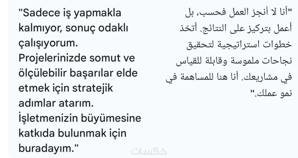ترجمة احترافية ودقيقة 100%: أضمن لك نقل المعنى والمحتوى بدقة تامة بين العربية والتركية (والعكس)، مع مراعاة الفروقات الثقافية والسياقية.