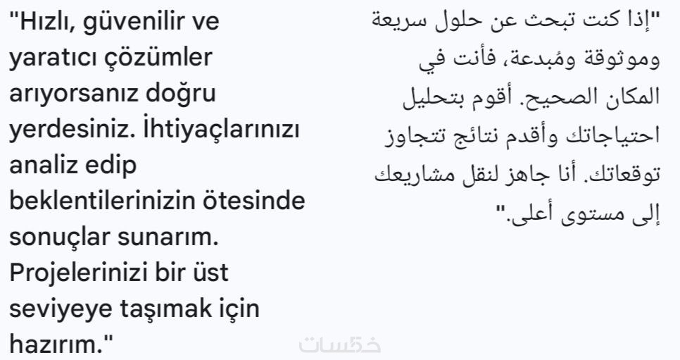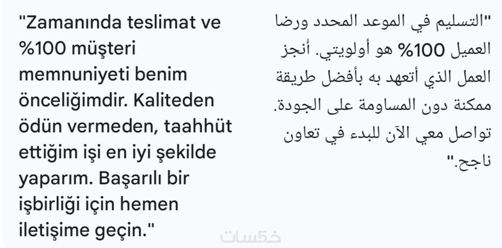خبرة متعمقة في اللغتين: لغتي الأم هي [العربية] وأتقن [التركية] بطلاقة، مما يضمن ترجمة سلسة وطبيعية، وليست حرفية.