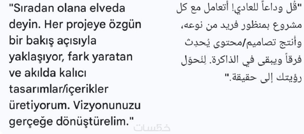 "هل تحتاج إلى ترجمة احترافية من التركية إلى العربية أو العكس؟ أنا هنا لأوفر لك خدمة ترجمة دقيقة وسريعة، حيث أترجم النصوص باحترافية في كافة المجالات: الأدبية، التقنية، القانونية، أو التجارية. أضمن لك ترجمة خالية من الأخطاء اللغوية. يمكنني التعامل مع النصوص القصيرة والطويلة على حد سواء، مع إمكانية تقديم ترجمات متخصصة إذا لزم الأمر."