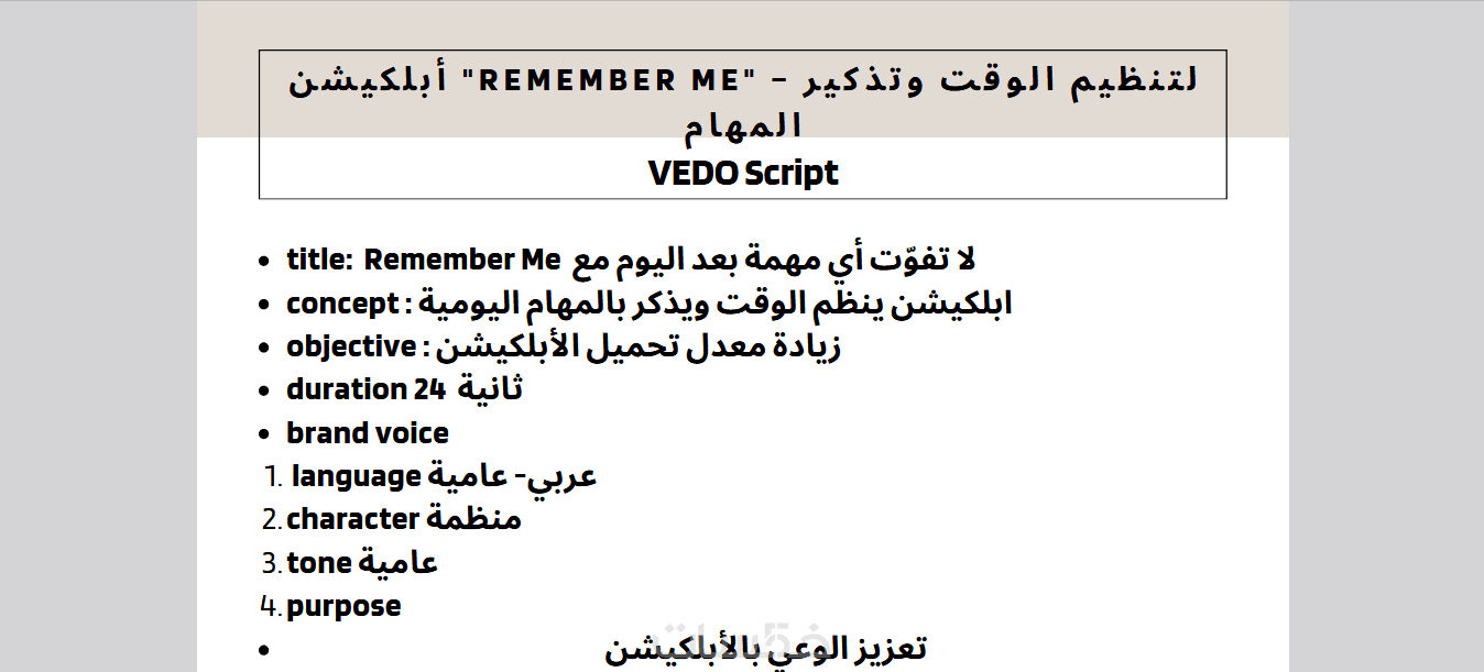 - نص الفيديو الذي يجب أن يتضمن معلومات عن المنتجات التجارية المراد ترويجها والرسالة التي تريد الشركة إيصالها للعملاء من الفيديو.