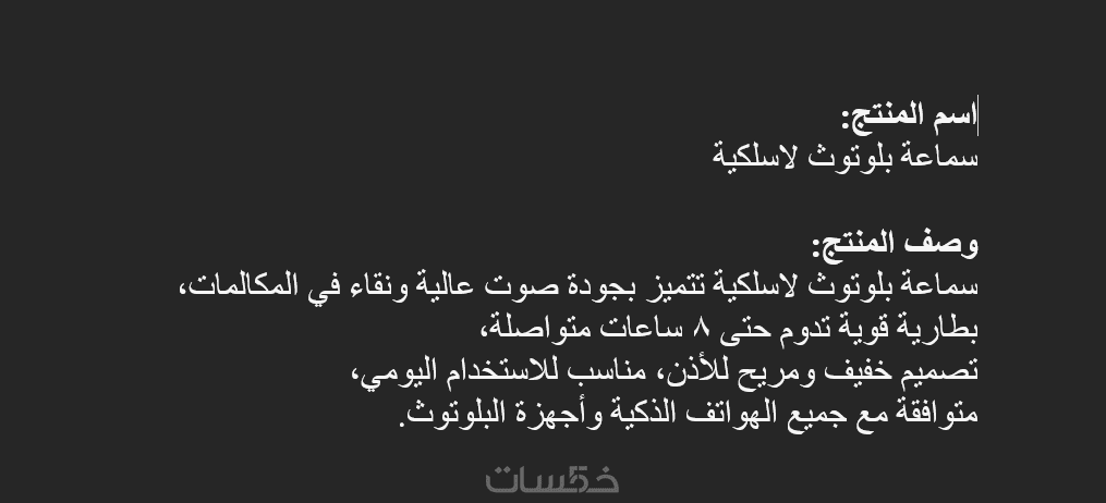 كتابه محتوي (وصف منتجاتProduct Description) وبيتسلم للمشتري نص فقطفي حدود 1000 كلمه و للمشتري طلب خدمه واحده فقط في كل مره