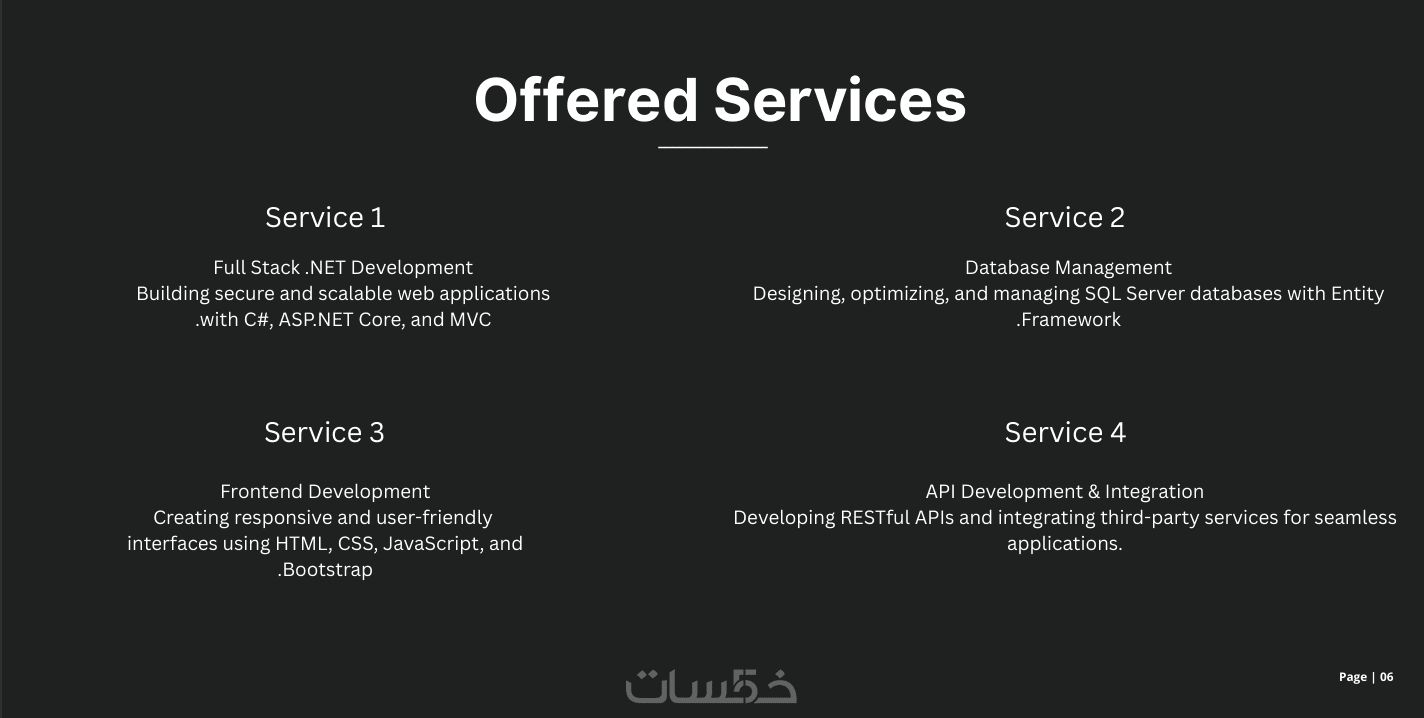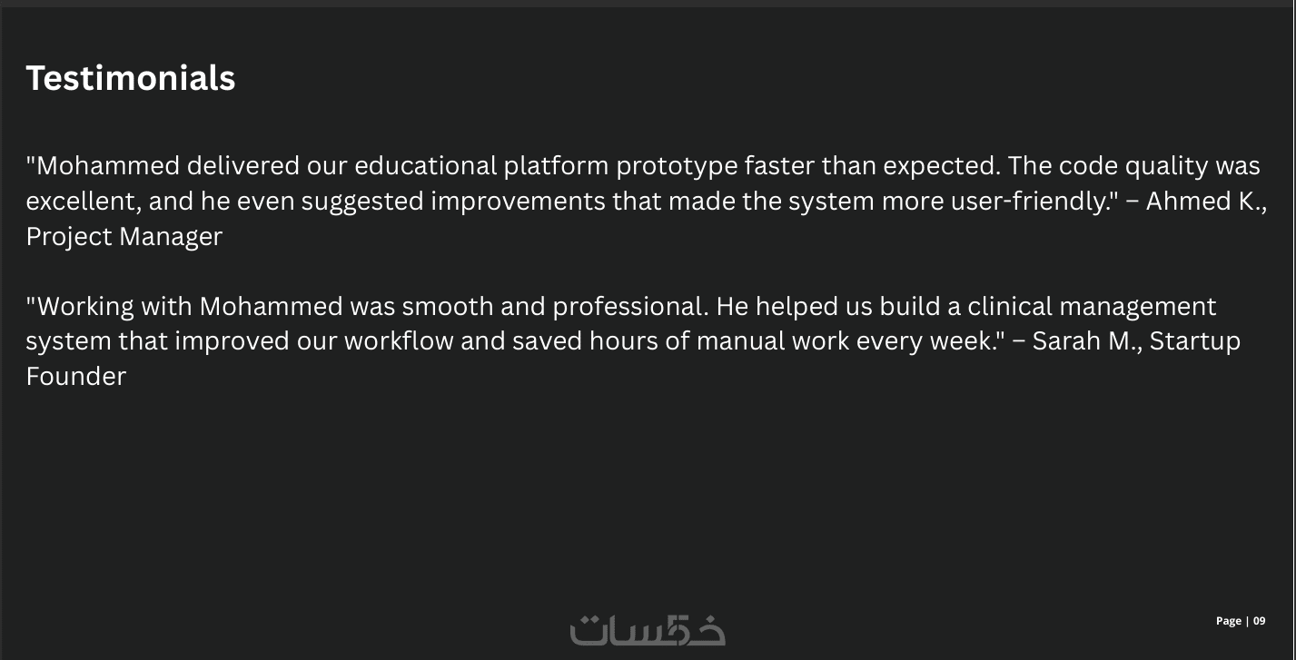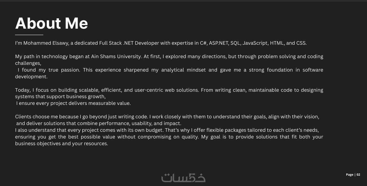 يتم تصميم البورتفوليو بدقة عالية وبأسلوب بصري مناسب لمجالك، سواء كنت مصمّمًا، مطوّرًا، مسوّقًا، مصورًا، أو أي تخصص آخر.
