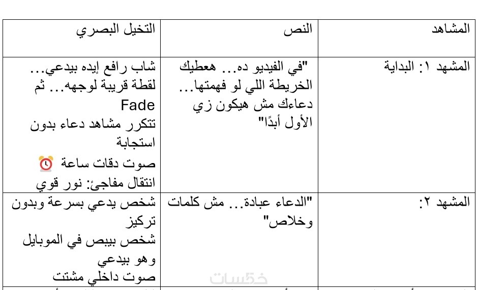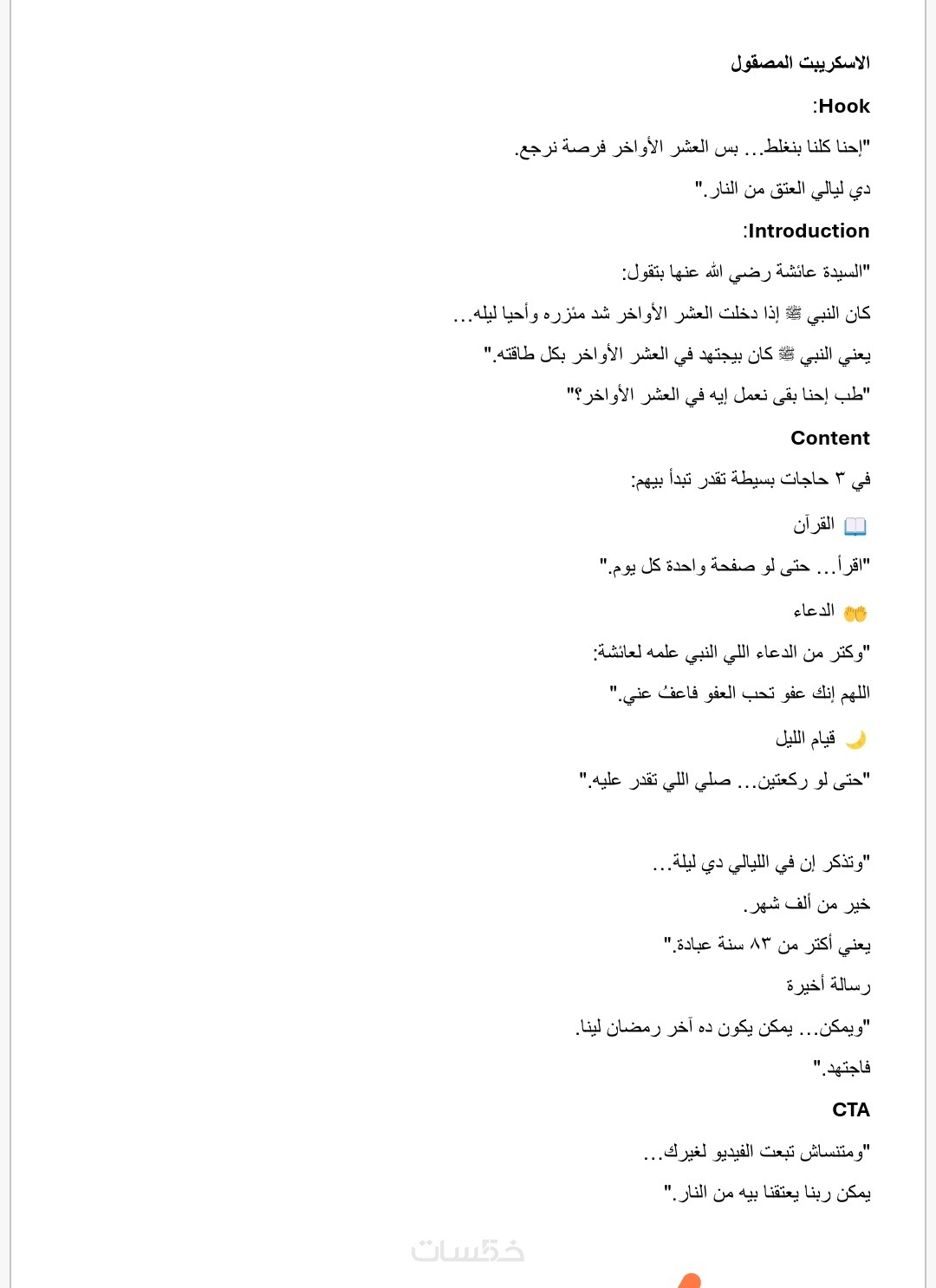 الخدمة الأساسية تشمل: كتابة سيناريو احترافي من 500 كلمة (تقريبًا 3–5 دقائق فيديو)